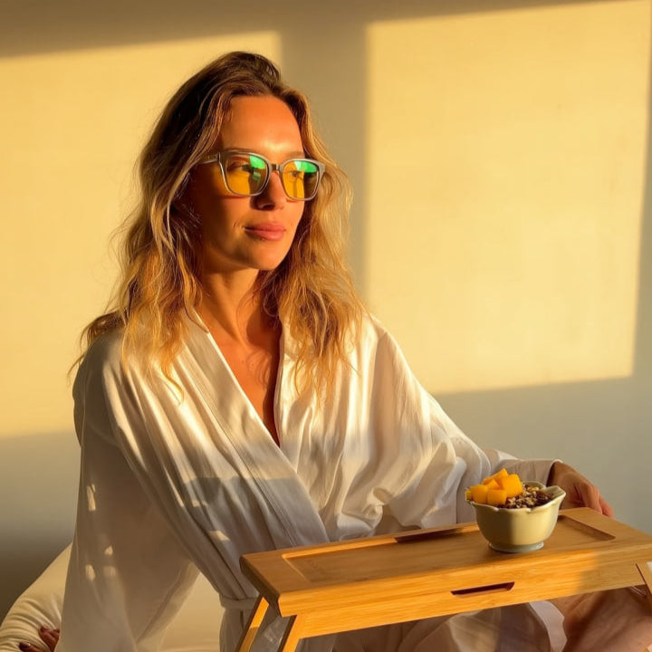 Óculos com lentes quentes bloqueiam a luz azul das telas com maior eficácia, protegendo seus olhos da luz artificial que comprovadamente é um disruptor hormonal.
