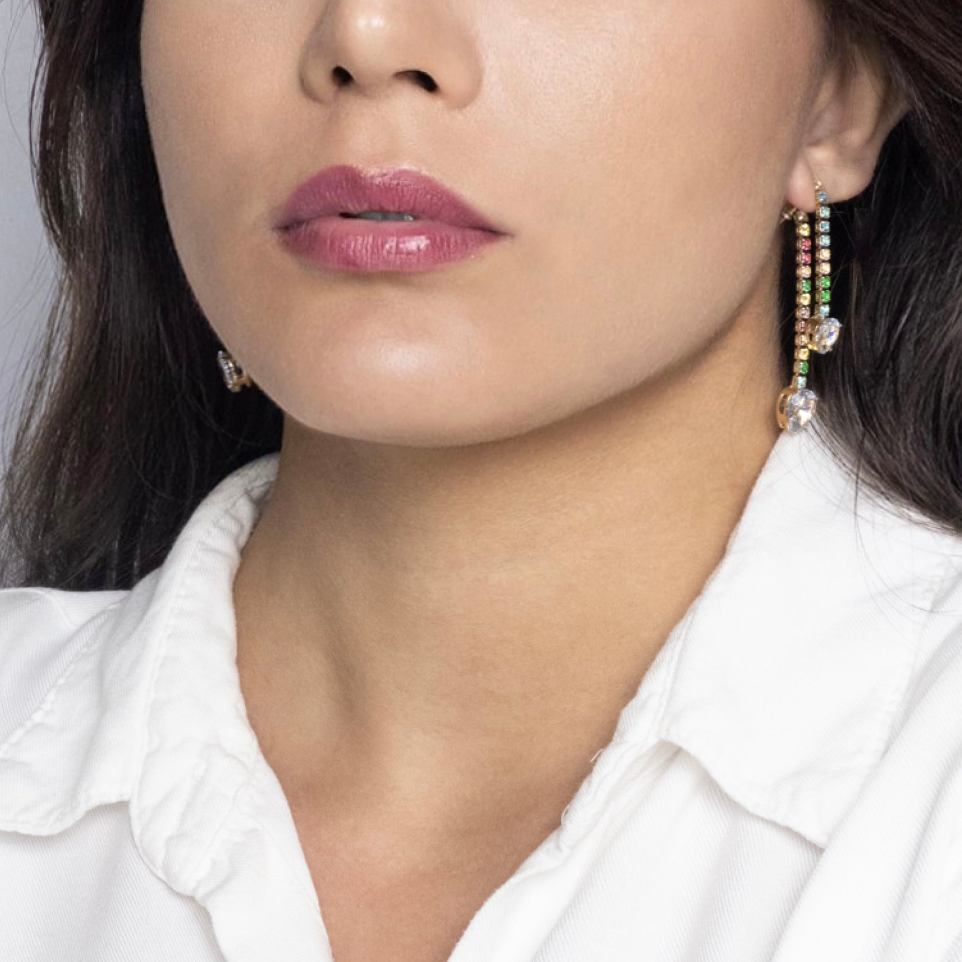 Este brinco apresenta um design contemporâneo com dois fios delicadamente unidos, realçados pelo brilho das zircônias cravejadas ao longo de sua extensão. Disponível em opções coloridas ou transparentes, permite uma personalização de estilo, adicionando um toque de cor vibrante ou optando pela sutileza do cristal transparente.