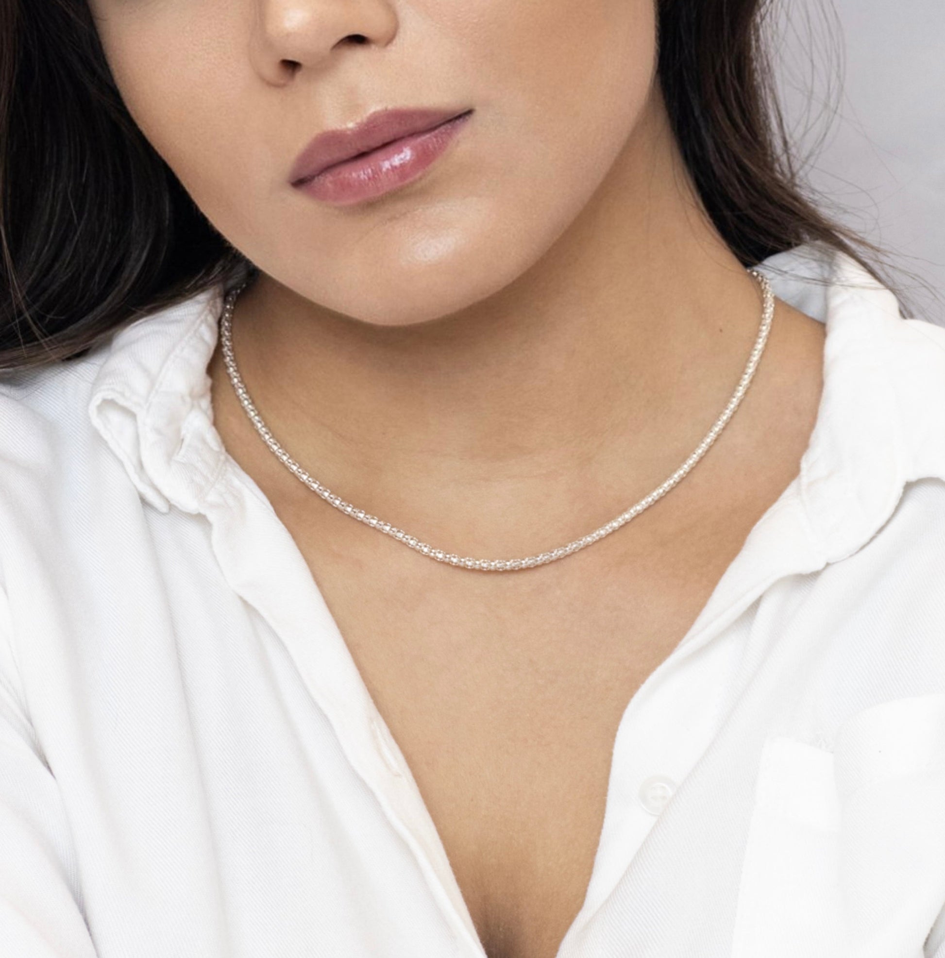 Com sua tonalidade prateada, esta corrente é um acessório atemporal que pode complementar uma ampla variedade de estilos e ocasiões. Seu acabamento polido confere um brilho deslumbrante que atrai olhares e adiciona um toque de refinamento a qualquer conjunto, seja para uso diário ou eventos especiais.